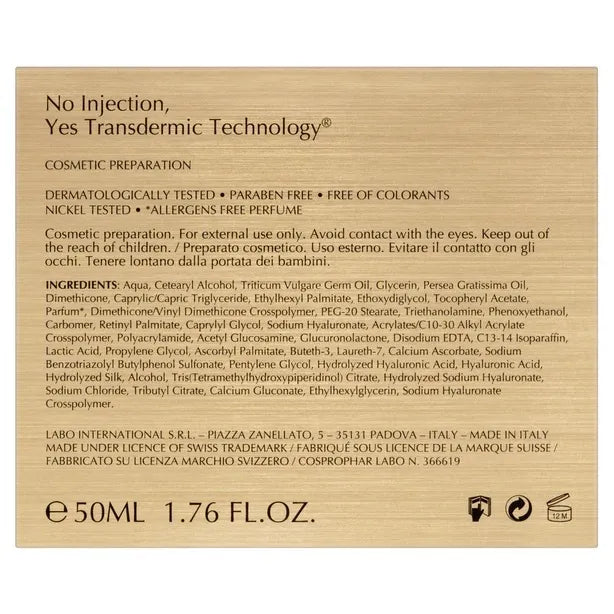 The specific active ingredients contained in the Labo Transdermic Anti-Age Renovating Smoothing Cream stimulate cell renewal and foster skin regeneration with smoothing effect. Furthermore, they improve cellular respiration and metabolism intervening in the metabolic processes and in energy production. The 8 Hyaluronic Acids with different molecular weights of Fillerina patent differently penetrate the cutaneous layers of both epidermis and dermis, thus providing an essential advantage to the skin.